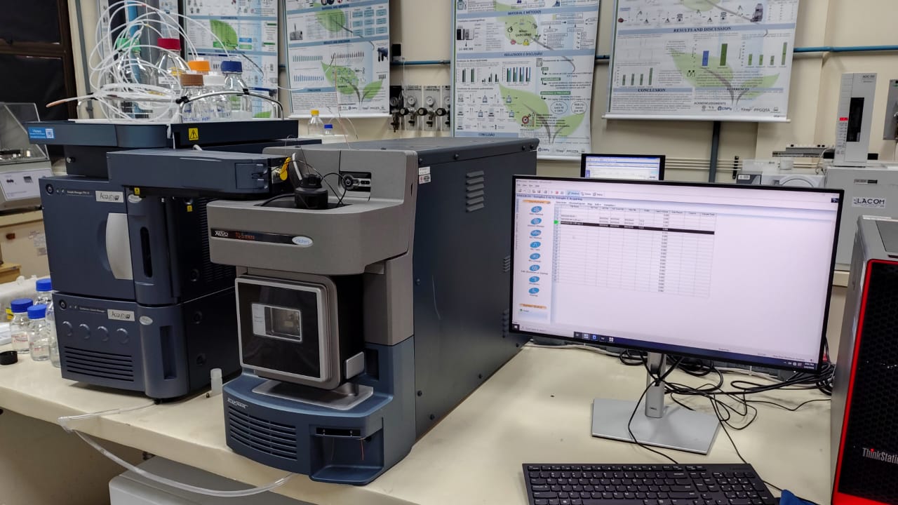 Descrição: Sistema UPLC-MS/MS (Waters, EUA), equipado com: cromatógrafo a líquido modelo Acquity H-Class, composto por bomba quatenária Acquity H-Class (Waters, EUA); detector MS do tipo triploquadrupolo; modelo Xevo TQ-S micro e amostrador automático sample manager FTN-H (Acquity) (Waters, EUA); interface/fonte de ionização por eletronebulização (ESI ZprayTM) (Waters, EUA);